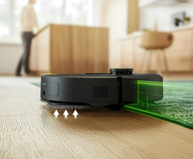 Când robotul detectează un covor, ridică automat lavetele, permițând aspirarea covoarelor în timp ce continuă să spele podelele dure simultan.