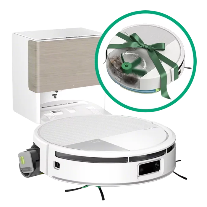 Setul include Roomba® Combo® 205 DustCompactor™ – un robot 2-în-1 care aspiră și spală, depozitând murdăria direct în interior, astfel încât necesită golire la aproximativ două luni.